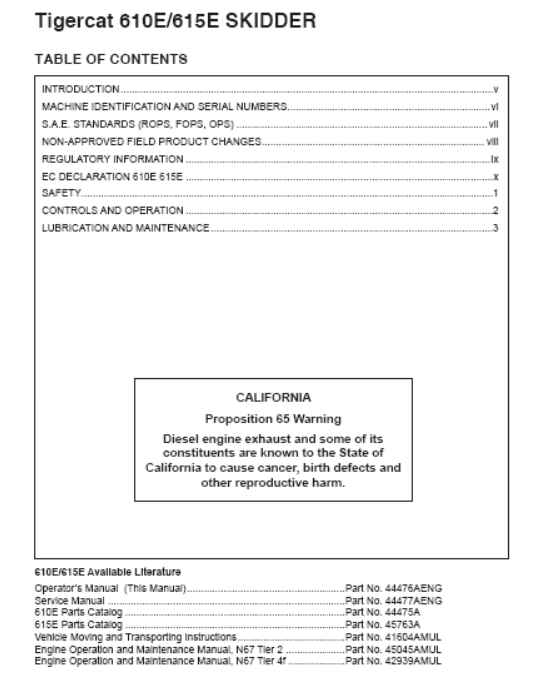 Introduction Machine Identification And Serial Numbers Sae Standards (Rops, Fops, Ops) Non-approved Field Product Changes Regulatory Information Ec Declaration 610e 615e Safety Controls And Operation Lubrication And Maintenance