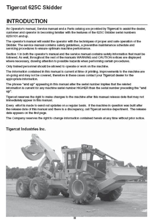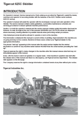 Get the most out of your Tigercat 625C Skidder with our comprehensive Operator/User Manual (6250101-6250300). Our PDF download provides expert instructions and detailed information, ensuring efficient and safe operation. Boost productivity and prolong the lifespan of your equipment with our valuable resource.