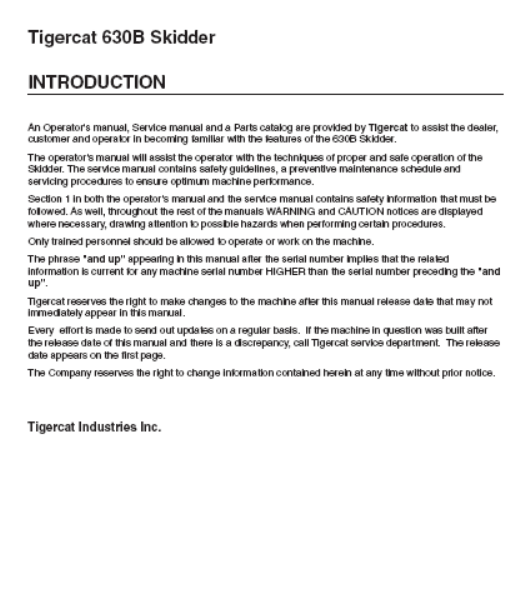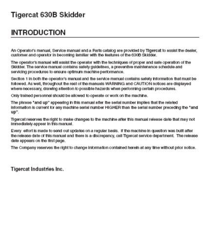 The Tigercat 630B Skidder Operator/User Manual is a comprehensive guide to using and operating the 630B model (6301001-6301999). This PDF file download includes important safety information, troubleshooting guidelines, and expert tips for optimizing performance and productivity with the skidder. Improve your understanding and become a proficient operator with this manual.