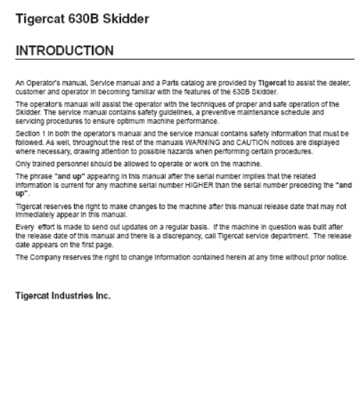 Become a skidder expert with the Tigercat 630B Skidder Service Repair Manual! This PDF download contains essential information for repairing your skidder and increasing its lifespan. Detailed instructions and diagrams make it easy to maintain and optimize your Tigercat's performance. Trust the experts and download your manual today!