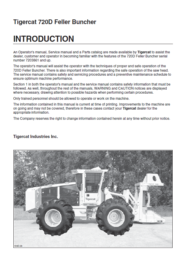 This service manual contains comprehensive technical information for servicing the Tigercat 720D Feller Buncher. Downloadable in PDF format, the manual covers models 7203501 to 7204400 and 7203861 to 7204400.