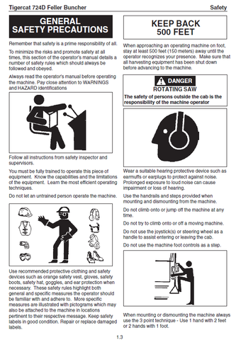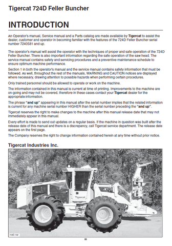This Tigercat 724D Feller Buncher Operator Manual offers detailed operating instructions for 7240201-7240999 and 7240581-7240999 models. Keep your machine running at peak performance levels with this comprehensive reference, featuring all the information needed to understand, troubleshoot, and maintain your equipment.