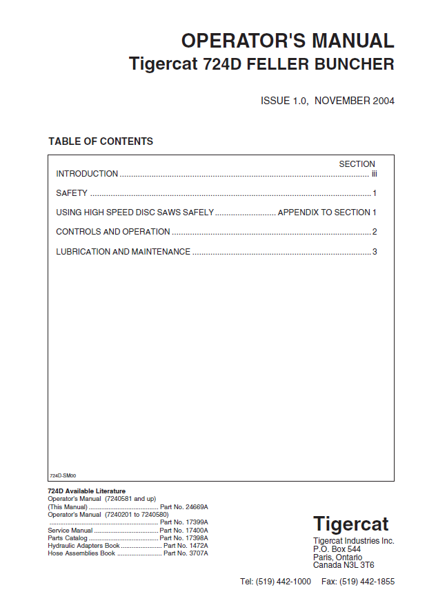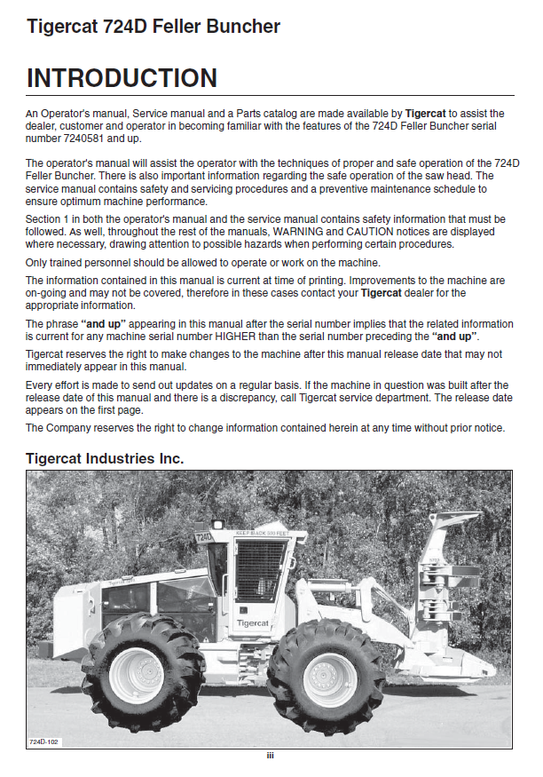 Download Complete Operator Manual For Tigercat 724D Feller Buncher | Serial No. (7240201-7240999, 7240581-7240999)