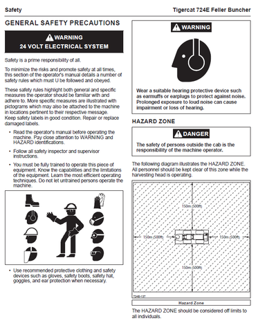 Stay informed about your Tigercat 724E Feller Buncher with this Operator Manual. Download this PDF and gain access to complete instructions to maintain your machine and keep it performing at its peak efficiency. Get the information you need to operate your 7241001-7243100 and 7243001-7243100 models safely and effectively.