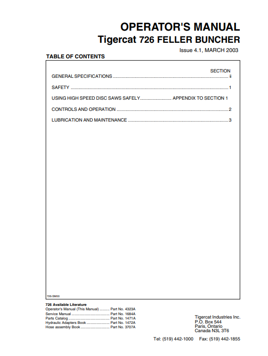 Download Complete Operator/User Manual For Tigercat 726 Feller Buncher | Serial No. (7260101-7260999)