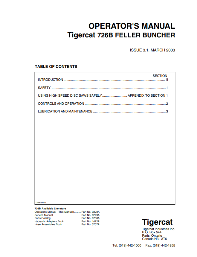 Download Complete Operator/User Manual For Tigercat 726B Feller Buncher | Serial No. (7261001-7261999)