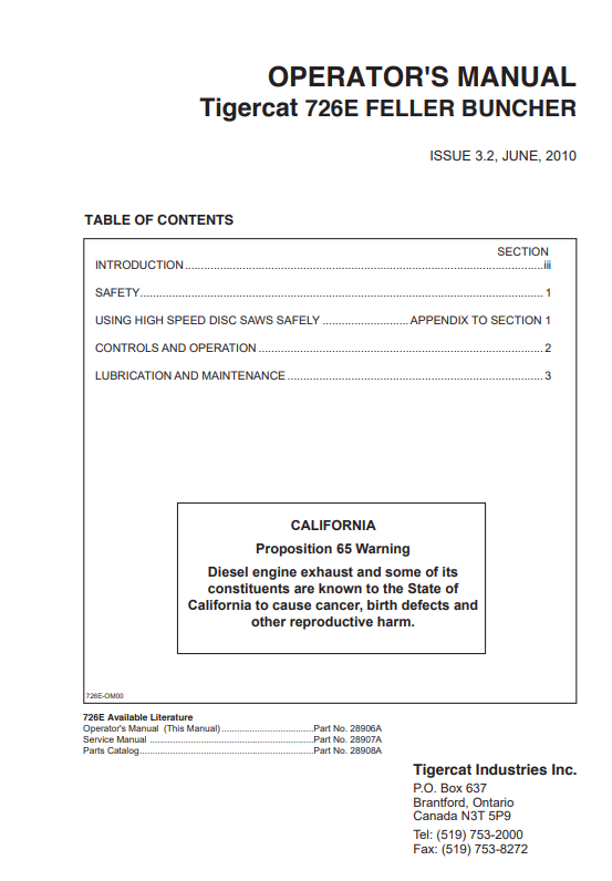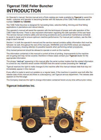 Download Complete Operator/User Manual For Tigercat 726E Feller Buncher | Serial No. (7262501-7265000, 7262501-7264000)