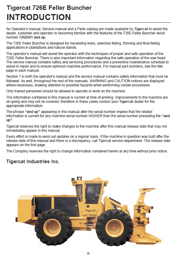 This professional Tigercat 726E Feller Buncher Service Manual includes comprehensive information for maintenance and repair. Engineered for the highest level of accuracy, it covers serial numbers 7262501-7265000 and 7262501-7264000. Access detailed specs, procedures, and diagrams with this easy-to-use PDF download.
