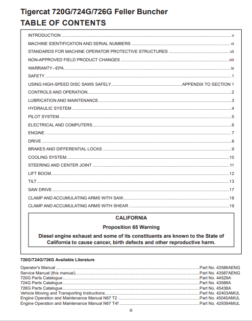 Introduction, Machine Identification And Serial Numbers, Standards For Machine Ator Protective Structures, Non-approved Field Product Changes, Warranty, Safety, Using High-speed Disc Saws Safely., Controls And Operation, Lubrication And Maintenance., Hydraulic System, Pilot System., Electrical And Computers, Engine, Drive, Brakes And Differential Locks, Cooling System., Steering And Center Join, Lift Boom, Tilt, Saw Drive, Clamp And Accumulating Arms With Saw, Clamp And Accumulating Arms With Shear