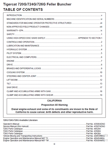 This service manual provides essential maintenance and service information for Tigercat 726G Feller Bunchers (models 7265001-7266700 and 7265001-7266000). With detailed instructions and diagrams, this comprehensive manual is a must-have resource for maintaining your equipment.