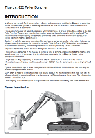 Tigercat 822 Feller Buncher Operator/User Manual (82011001-82012000, 822010191-82210999) - PDF File Download