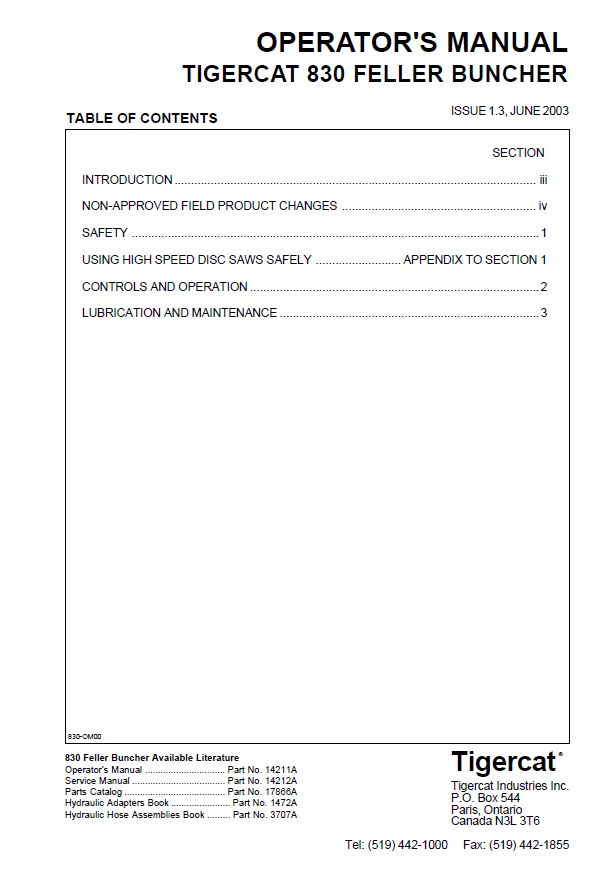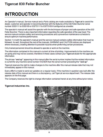 Download Complete Operator Manual For Tigercat 830 Feller Buncher | Serial No. (8300113-8300499)