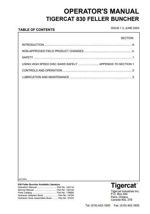 Tigercat 830 Feller Buncher Operator/User Manual (8300113-8300499) - PDF File Download