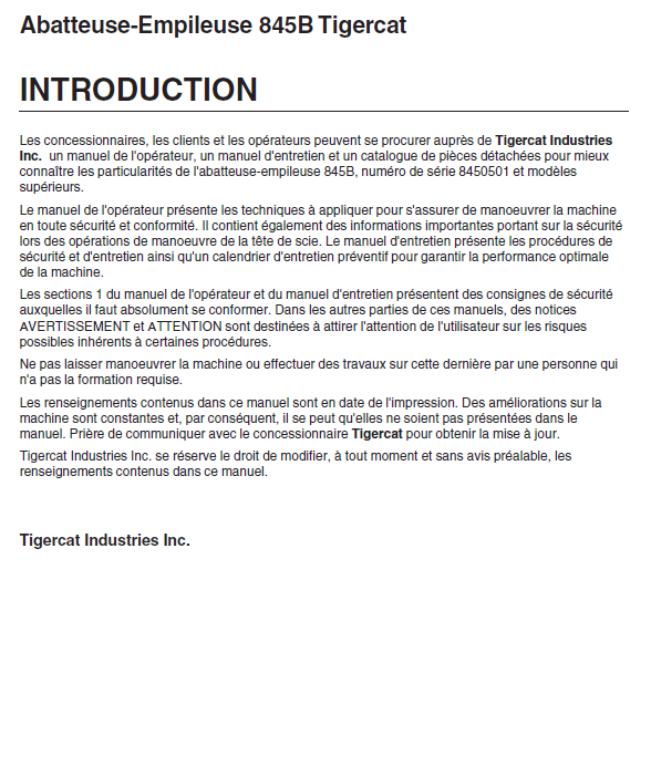 Download Complete Operator Manual For Tigercat 845B Feller Buncher | Serial No. (8450501-8451499)