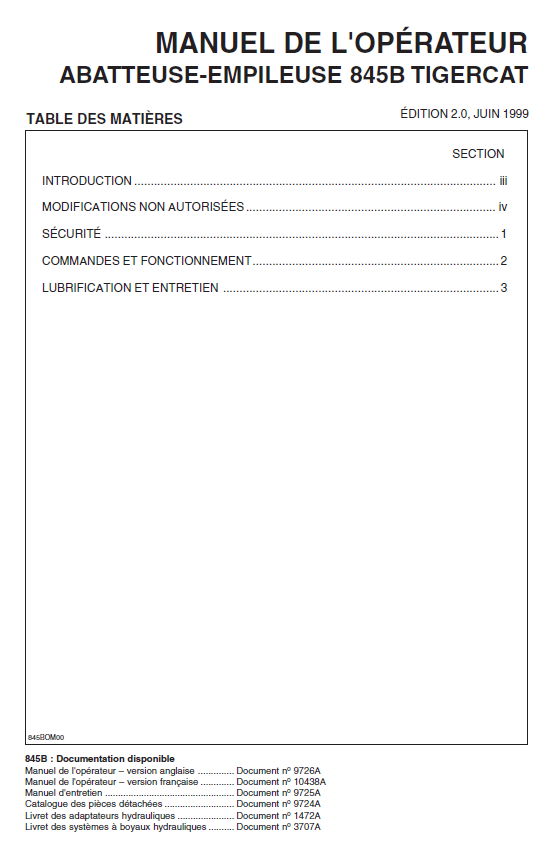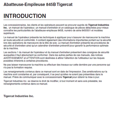 This digital PDF download is a comprehensive operator manual for the Tigercat 845B Feller Buncher, serial numbers 8450501-8451499. It includes detailed maintenance and operating instructions as well as safety guidelines to ensure reliable and efficient performance.