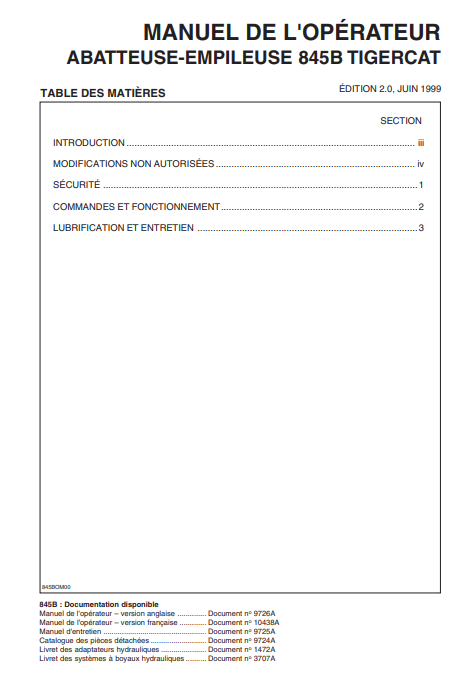 This PDF file contains the operator/user manual for the Tigercat 845B Feller Buncher. With this manual, you will have all the necessary information and instructions to safely and efficiently operate the machine. Improve your performance and productivity with this essential resource.