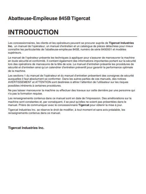 Tigercat 845B Feller Buncher Operator/User Manual (8450501-8451499) - PDF File Download