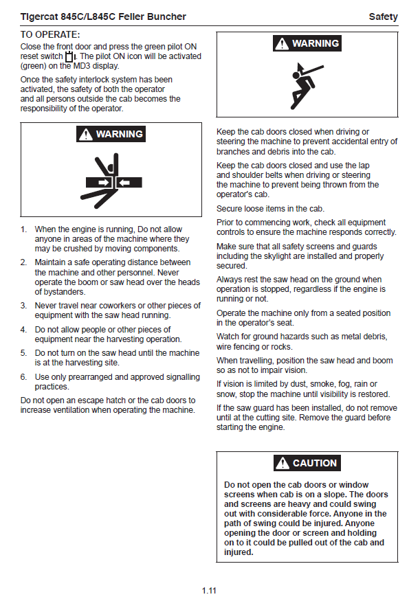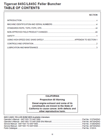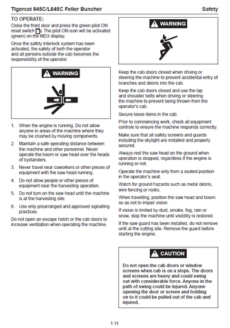 Download Complete Operator Manual For Tigercat 845C Feller Buncher | Serial No. (84511501-84512500, 84511861-84512500)