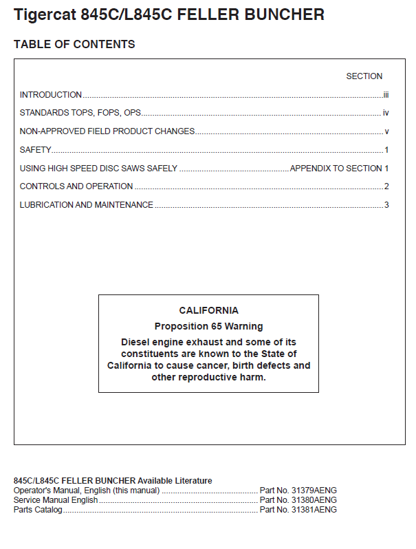 TIGERCAT 845C FELLER BUNCHER OPERATOR MANUAL (84511501-84512500, 84511501-84511860) - PDF FILE DOWNLOAD
