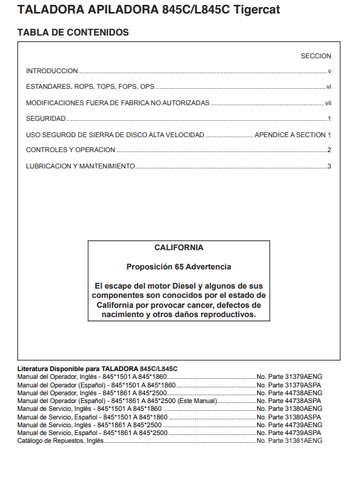 Download Complete Operator/User Manual PDF For Tigercat 845C Feller Buncher | Serial No. (84511501-84512500, 84511861-84512500) - Spanish
