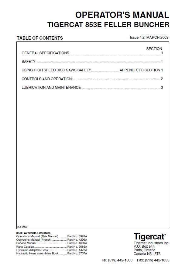 Download Complete Operator Manual For Tigercat 853T Feller Buncher | Serial No. (853T393-853T499)