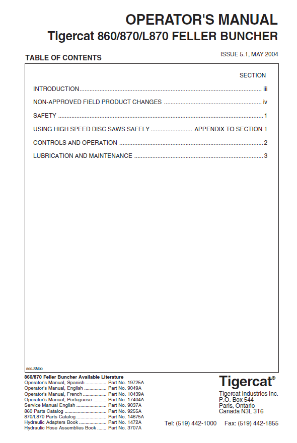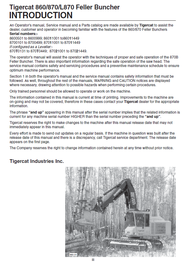 This official Tigercat 860 Feller Buncher Operator/User Manual is the authoritative source for comprehensive information needed to operate and maintain your Tigercat 860 Feller Buncher. Featuring easy to follow instructions and diagrams, this PDF download is essential for efficient operation and maintenance of your Tigercat 860 Feller Buncher.