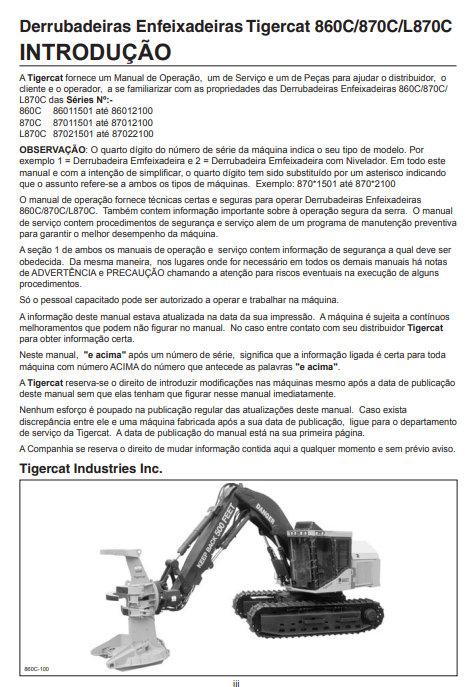 Download Complete Operator/User Manual PDF For Tigercat 860C Feller Buncher | Serial No. (86011501-86013500, 86011501-86012100) - Portuguese