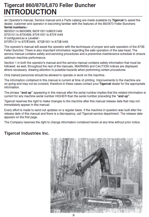Download Complete Operator/User Manual For Tigercat 870 Feller Buncher | Serial No. (8700101-87011499)