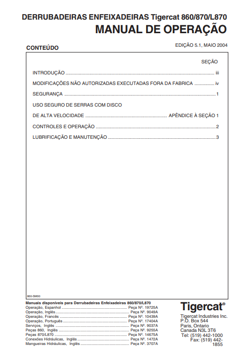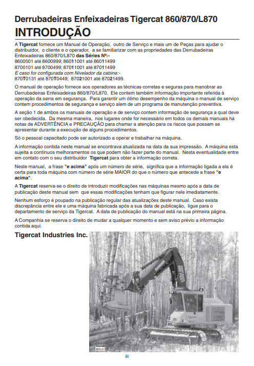 Download Complete Operator/User Manual PDF For Tigercat 870 Feller Buncher | Serial No. (8700101-87011499) - Portuguese