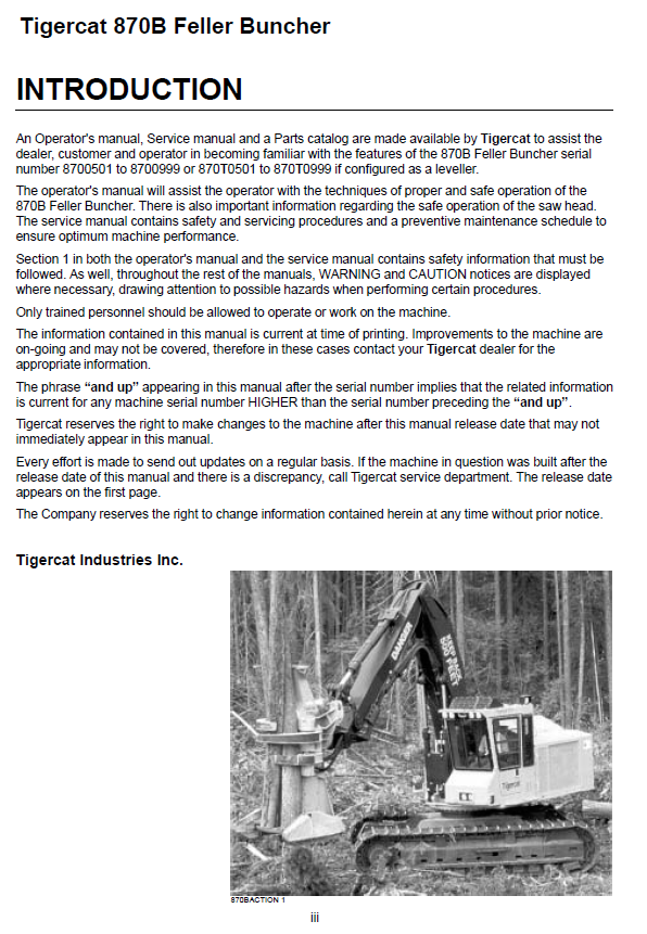 This user manual for Tigercat 870B Feller Bunchers is an official PDF file download containing detailed instructions on operation and maintenance. It provides comprehensive information on the features and operation of the machine, and is an essential resource for professionals and hobbyists alike.