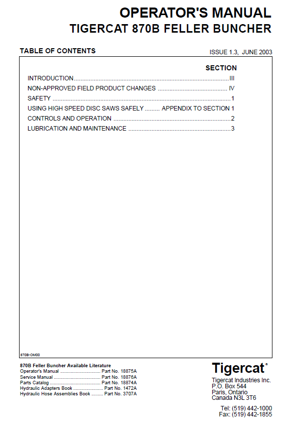 Download Complete Operator/User Manual For Tigercat 870B Feller Buncher | Serial No. (8700501-8700999)