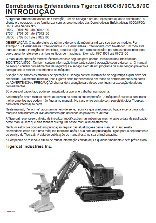 This official Tigercat 870C Feller Buncher Service Manual provides detailed instructions for service and maintenance on models 87011501-87013500 and 87011501-87012100. Download the PDF file to access vital troubleshooting information and mechanical specifications.