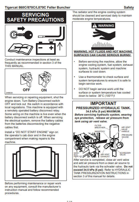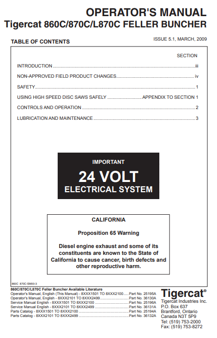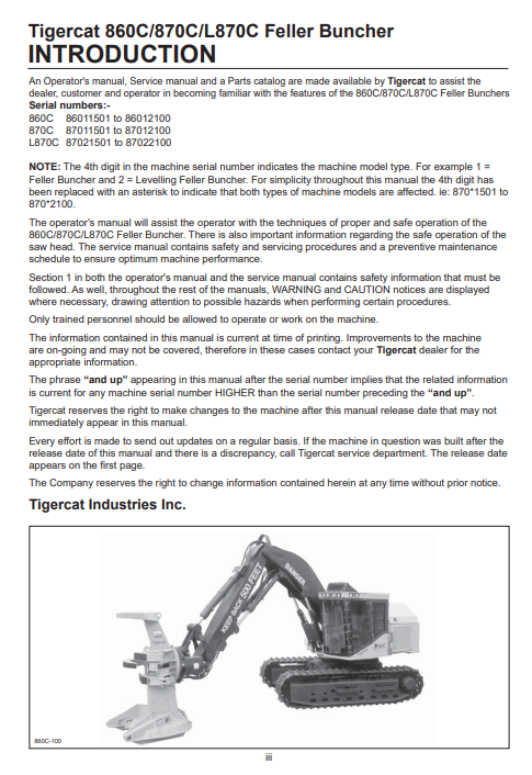 Tigercat 870C Feller Buncher Operator/User Manual (87011501-87013500, 87011501-87012100) - PDF File Download