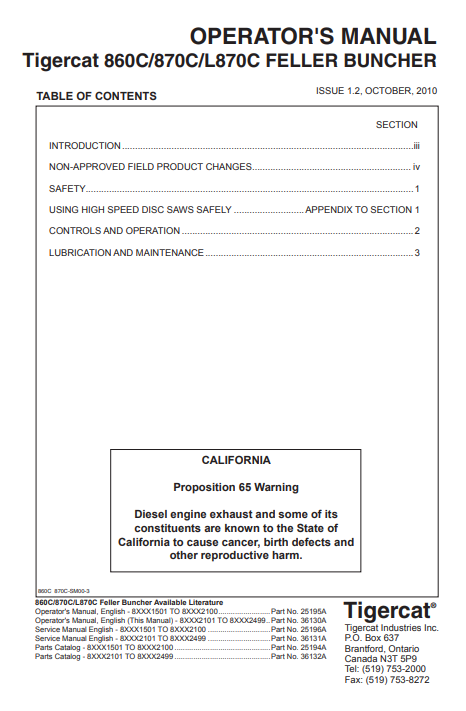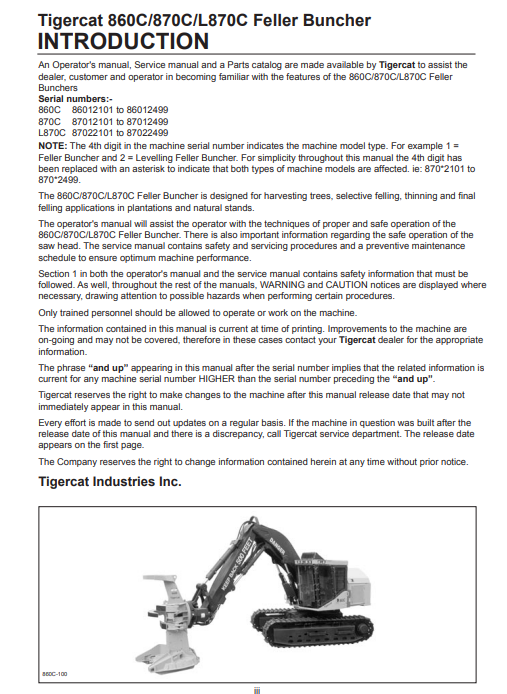 Tigercat 870C Feller Buncher Operator/User Manual (87011501-87013500, 87012101-87012499) - PDF File Download