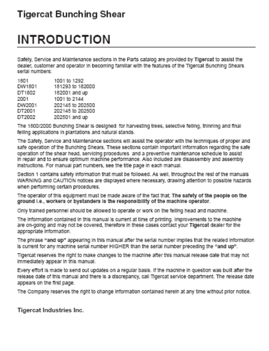 Learn how to safely and effectively operate your Tigercat Bunching Shear with this comprehensive safety, service, and maintenance manual. This PDF file download provides crucial information and expert guidance to ensure your machine and crew are operating at their best. Increase productivity while reducing downtime.