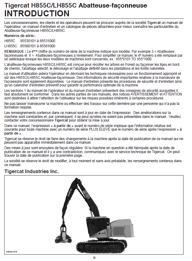Download Complete Operator/User Manual For Tigercat H855C Harvester | Serial No. (85530101-85532000, 85530101-85531000)