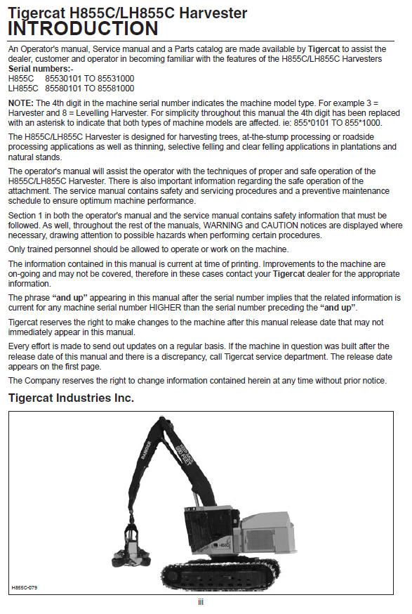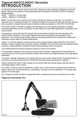 This digital PDF file download of Tigercat H855C Harvester Service Repair Manual is the latest, most comprehensive manual available for troubleshooting and servicing the Tigercat H855C Harvester. Covers service repair for 85530101-85532000 and 85530101-85531000. Get the comprehensive guidance you need to safely service and repair your harvester.