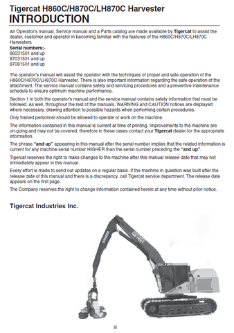 Download Complete Operator/User Manual For Tigercat H860C Harvester | Serial No. (86031501-86032499)