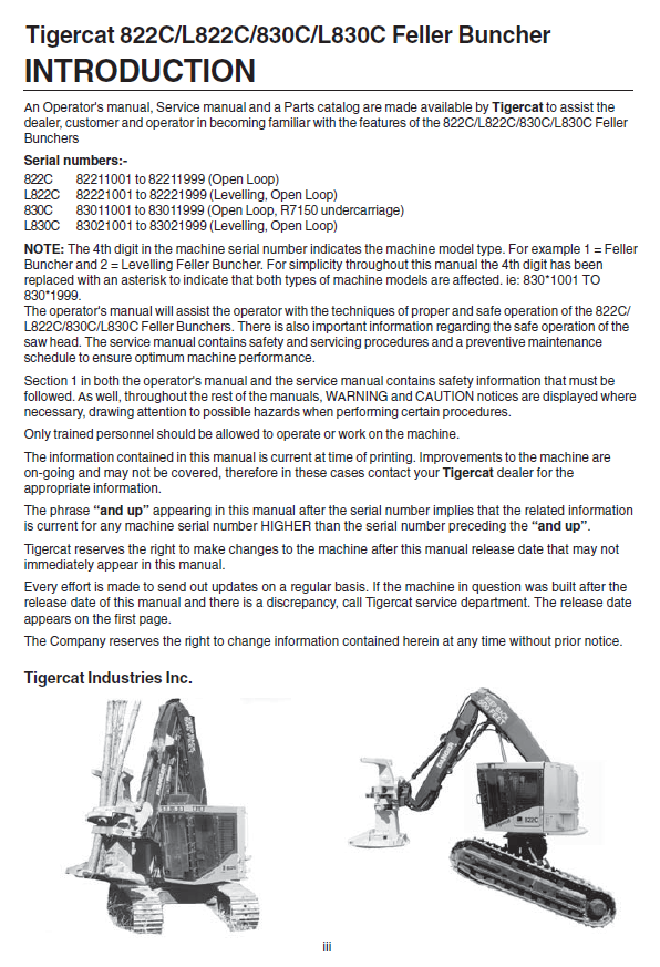 This Tigercat L822C Feller Buncher Operator/User Manual covers technical and operational information for model numbers 82221001-82223000 and 82221001-82221999. This manual file is available for download in PDF format, giving you access to an organized, clear, and up-to-date resource.