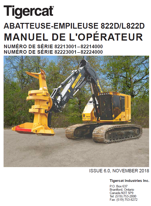 This Tigercat L822D Feller Buncher Operator/User Manual provides essential information for proper operation, maintenance, and safety protocols of the L822D Feller Buncher ranging from model numbers 82223001–82224000. Download now for the most up-to-date advice and procedures to keep your machine running smoothly.