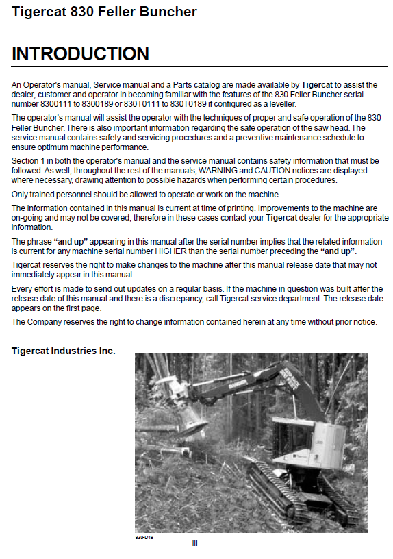 Download Complete Operator/User Manual For Tigercat L830 Feller Buncher | Serial No. (830T0101-83020999, 830T0101-830T0499)