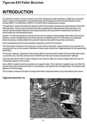 This is a PDF file download of the Tigercat L830 Feller Buncher Operator/User Manual. It covers L830 Feller Buncher models between 830T0101-83020999 and 830T0101-830T0499. Download it now to get detailed information about your machine's features and operations.