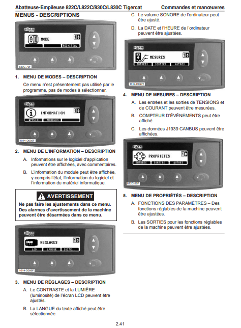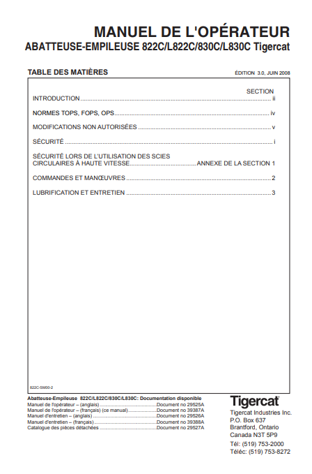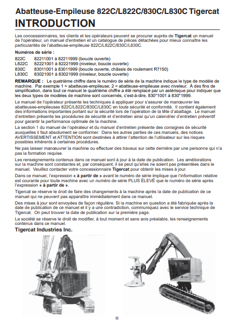 Download Complete Operator/User Manual PDF For Tigercat L830C Feller Buncher | Serial No. (83021001-83023000, 83021001-83021999) - French