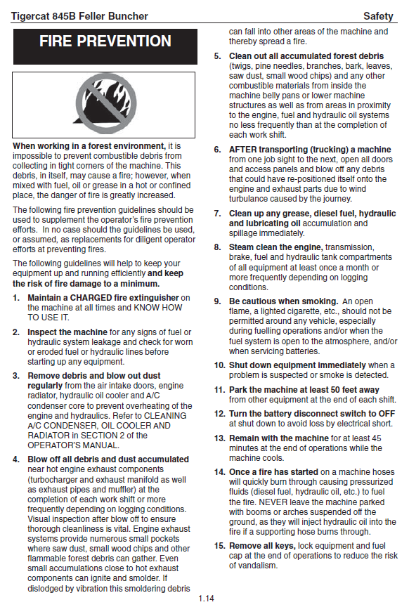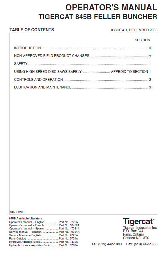 Download Complete Operator/User Manual For Tigercat L845B Feller Buncher | Serial No. (845T0501-845T1499)
