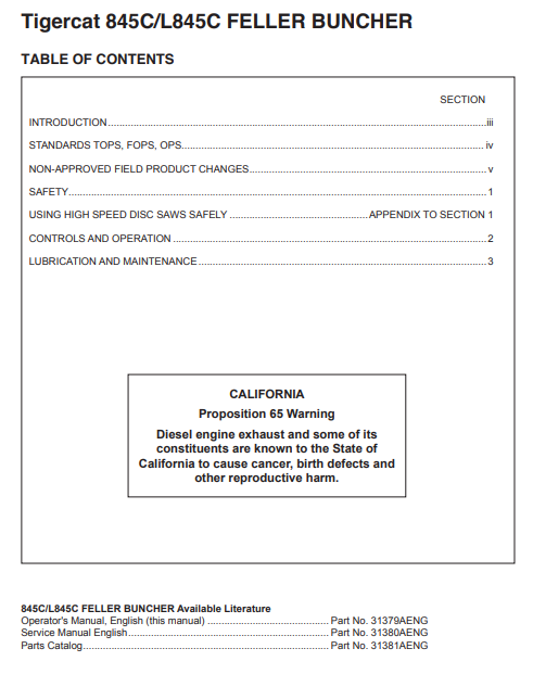 Tigercat L845C Feller Buncher Operator/User Manual (84521501-84522500, 84211501-84521860) - PDF File Download