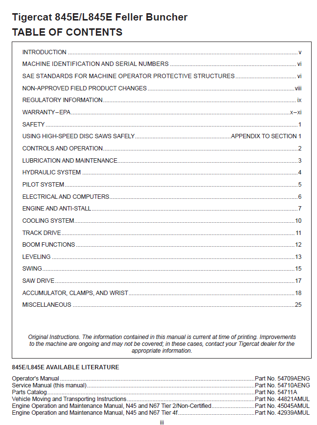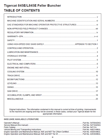 This service manual is designed to provide Tigercat L845E Feller Buncher owners and operators with technical support information and components needed for repairs and maintenance. This manual covers all systems of the 84523001-84523500 series, and includes detailed specifications and diagrams to support completion of any repair or service work.