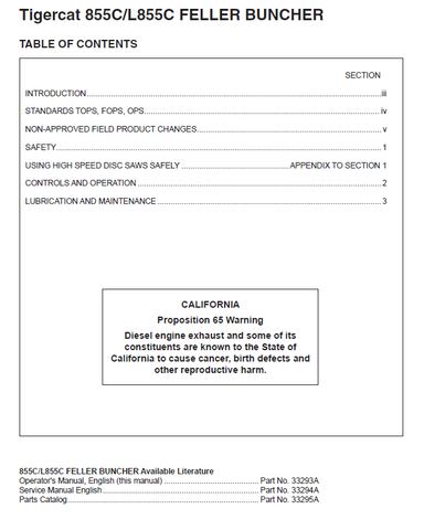 This user manual for the Tigercat L855C Feller Buncher provides detailed instructions on operation and maintenance to ensure optimal performance. The manual covers topics from basic safety instructions to maintenance, adjustments, and troubleshooting. With this knowledge base, operators will be able to confidently and efficiently use this high-technology machine.