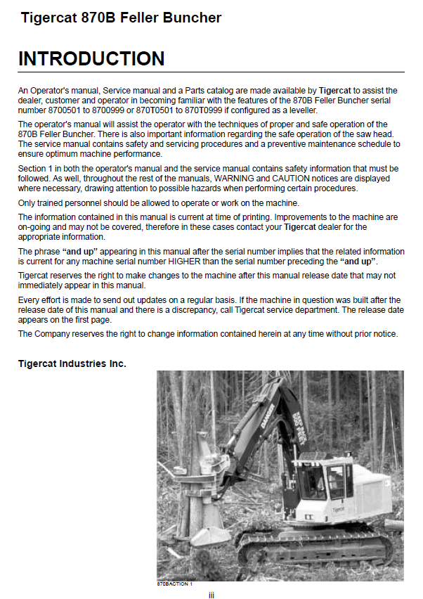 Download Complete Operator/User Manual For Tigercat L870B Feller Buncher | Serial No. (870T0501-870T0999)