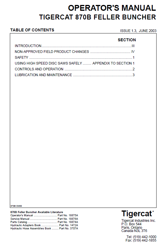 TIGERCAT L870B BUNCHER OPERATOR/USER MANUAL
