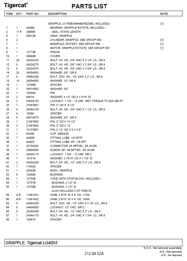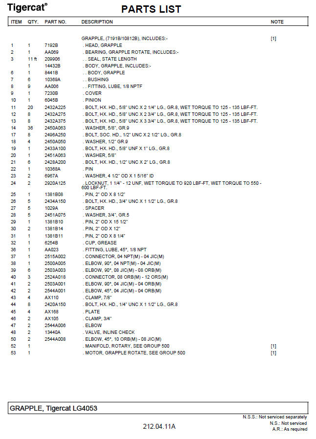 TIGERCAT LG4053HP LOADER GRAPPLE PARTS MANUAL